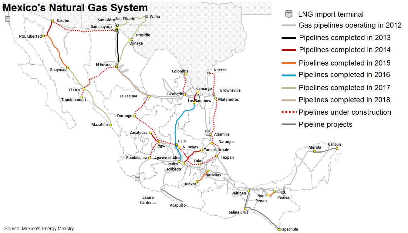 Se não houver mais atrasos, os nove gasodutos programados para inaugurar neste ano e no ano que vem oferecerão uma capacidade combinada de 271,8 milhões de metros cúbicos por dia, o equivalente a 11 por cento da produção total de gás dos EUA, segundo dados do Ministério da Energia do México, da Administração de Informação de Energia dos EUA (EIA, na sigla em inglês) e da TransCanada.