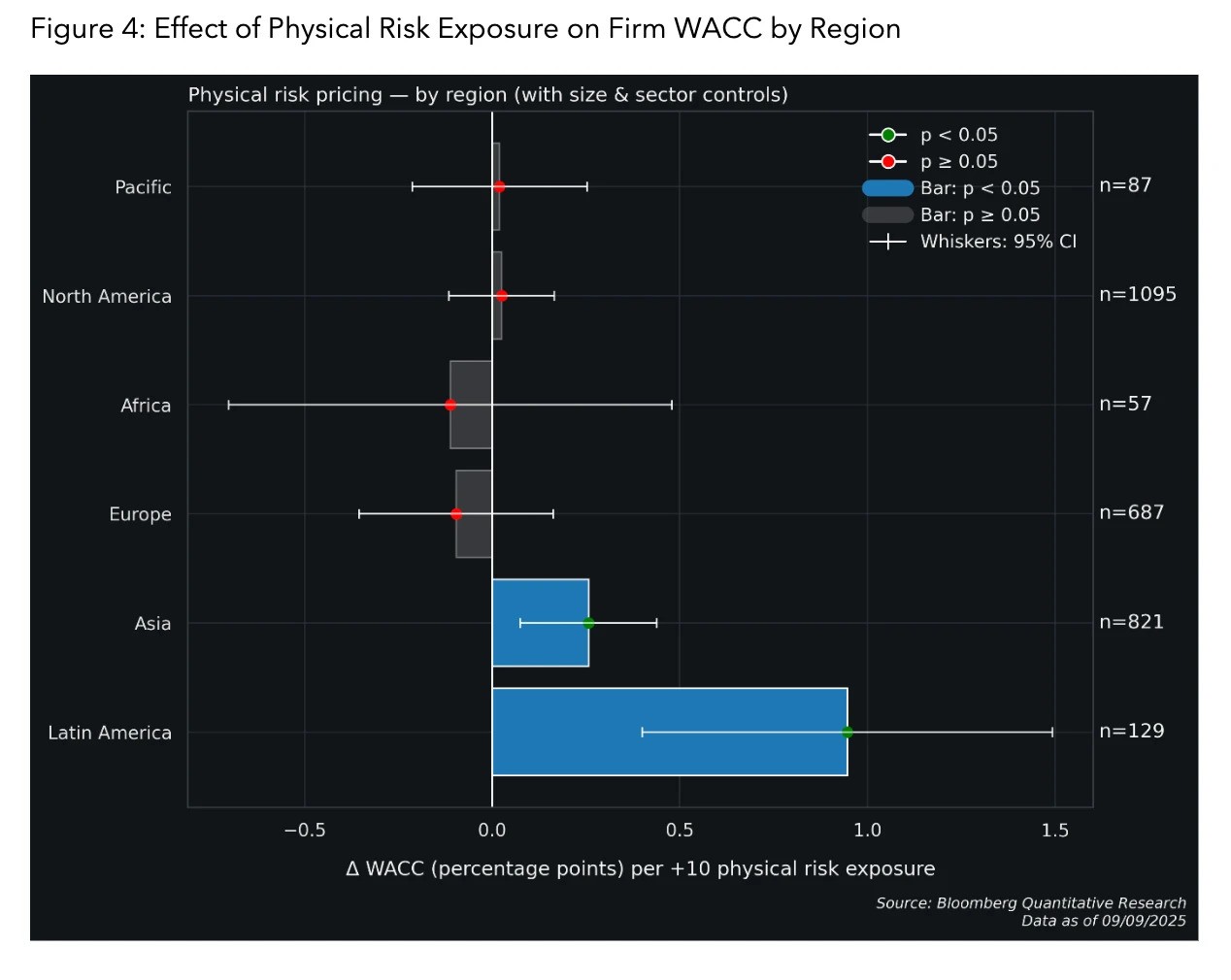 Regionalmente, uma maior exposição ao risco físico (+10) está associada a um WACC mais elevado nos mercados emergentes da América Latina (+94 pontos-base) e da Ásia (+25 pontos-base), após o controle das diferenças setoriais (ver Figura 4).