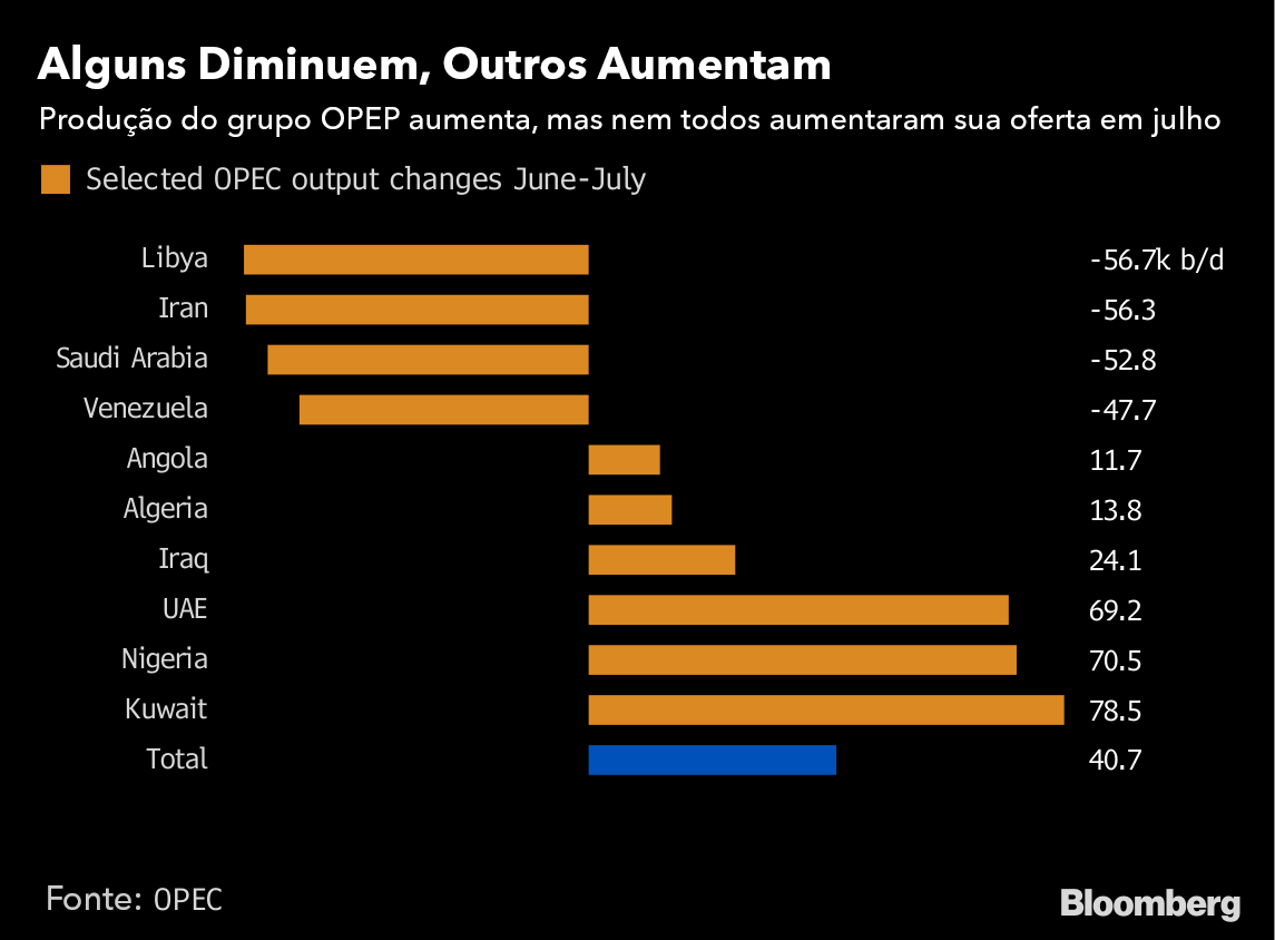 Em comunicações diretas com a Opep, a Arábia Saudita anunciou que sua produção mensal de petróleo caiu 201.000 barris por dia em julho, o que significa que o país extraiu 10.288 milhões de barris por dia no mês passado — menos que os 10.387 milhões de barris informados por fontes secundárias compiladas pela Opep. A pesquisa mensal da Bloomberg sobre a produção de petróleo da Opep colocou a produção de petróleo do país do Oriente Médio em 10,65 milhões de barris por dia no mês passado.