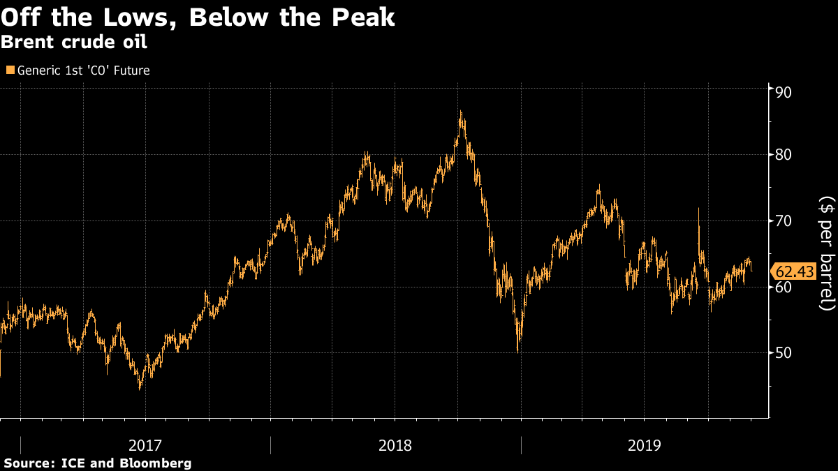 O petróleo tipo Brent tem sido negociado na casa de US$ 60 o barril na maior parte de 2019, uma valorização de 14% em relação ao início do ano, mas bem abaixo do pico de US$ 75,60 o barril visto no fim de abril.