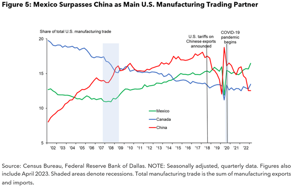 Conforme descrito na Figura 5, o México teve vantagens econômicas decorrentes da dissociação entre os EUA e a China. O país vem se destacando cada vez mais como um destino atraente para o setor de manufatura, especialmente no âmbito do acordo USMCA e em meio às tarifas dos EUA sobre as exportações chinesas. De acordo com dados do Censo dos EUA, o México ultrapassou a China em 2022 e se tornou o principal parceiro comercial de manufatura dos EUA.
