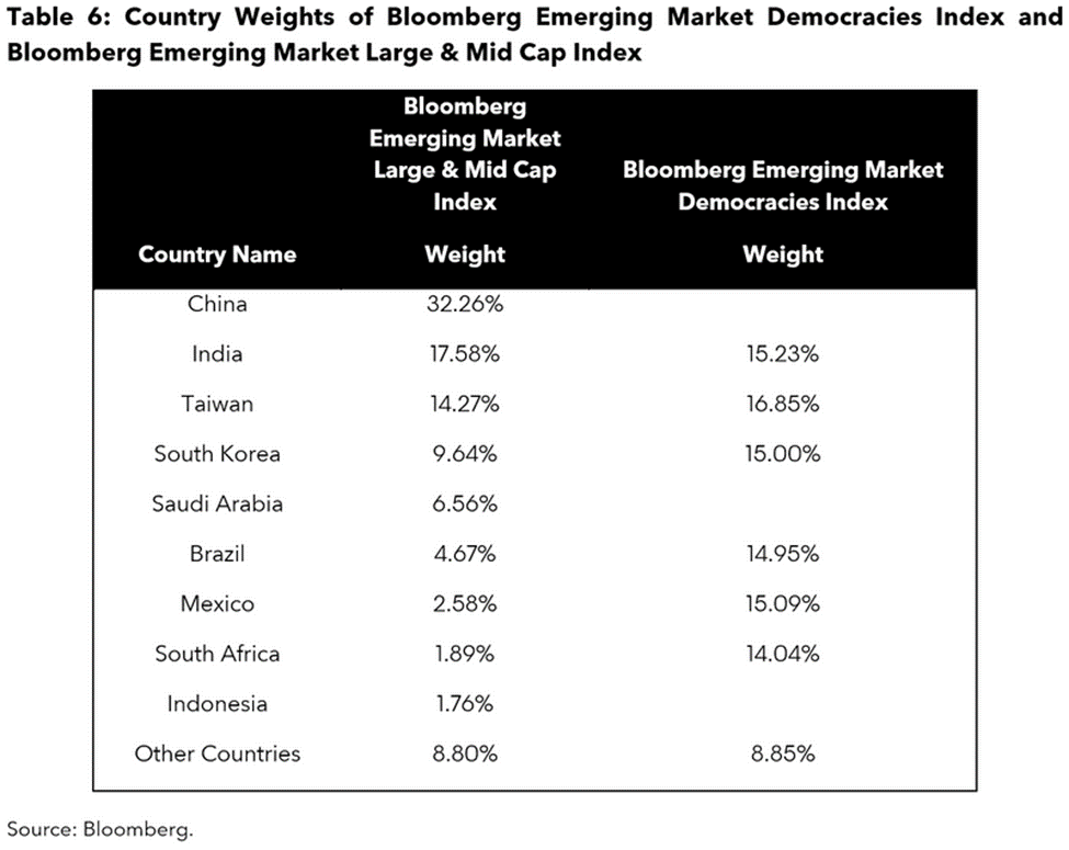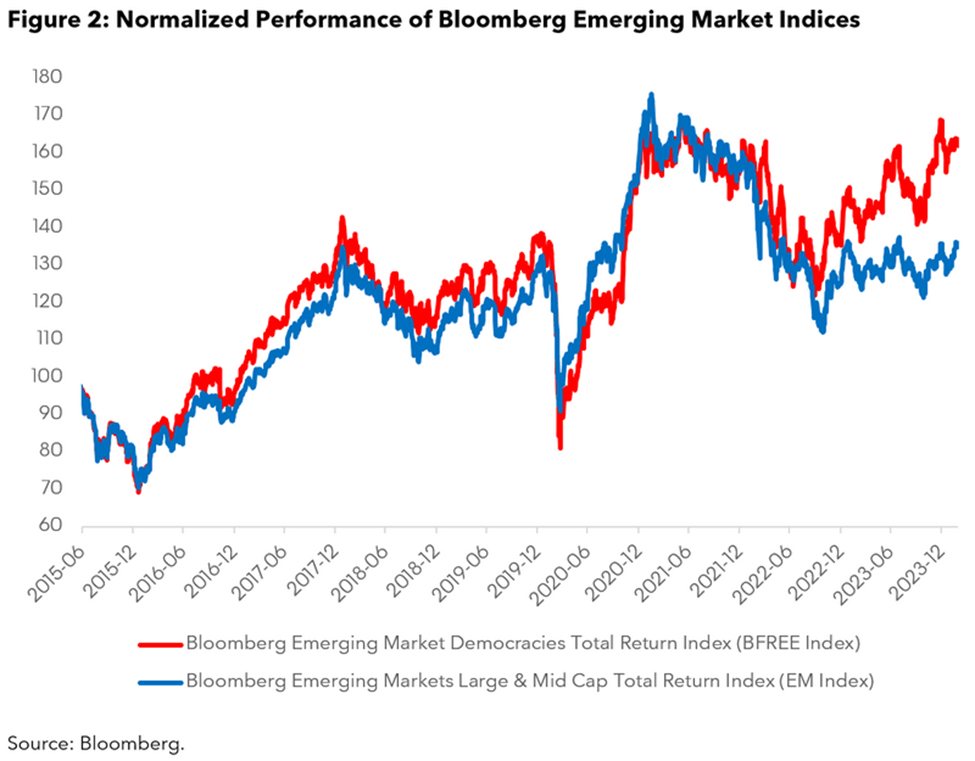 Considerando tanto os riscos quanto as oportunidades, a Bloomberg apresentou um novo índice de mercados emergentes: o índice Bloomberg Emerging Market Democracies (BFREE Index). Com um conjunto de dados abrangente da Freedom House, o índice BFREE oferece aos investidores acesso a ações de países classificados como democracias eleitorais. Usando o índice BFREE como exemplo, este artigo descreve o risco e os retornos do investimento em democracias, como uma alternativa aos índices EM convencionais (detalhes da elaboração do índice BFREE podem ser encontrados aqui).