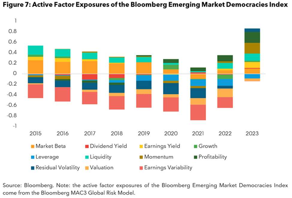 Além das exposições por país, o índice Bloomberg Emerging Markets Democracies também tem exposições interessantes a fatores de estilo, conforme mostrado na Figura 7. De modo geral, o índice BFREE apresenta maior liquidez, beta de mercado ligeiramente mais alto, menor alavancagem financeira, menor variabilidade dos resultados, menor volatilidade residual e valuation mais barato. No geral, o índice BFREE representa uma evolução na qualidade. Desde 2021, surgiram novas tendências: o índice BFREE se tornou mais lucrativo do que o índice EM mais amplo, mostrou um impulso mais forte no preço das ações, enquanto seu beta ativo também caiu.