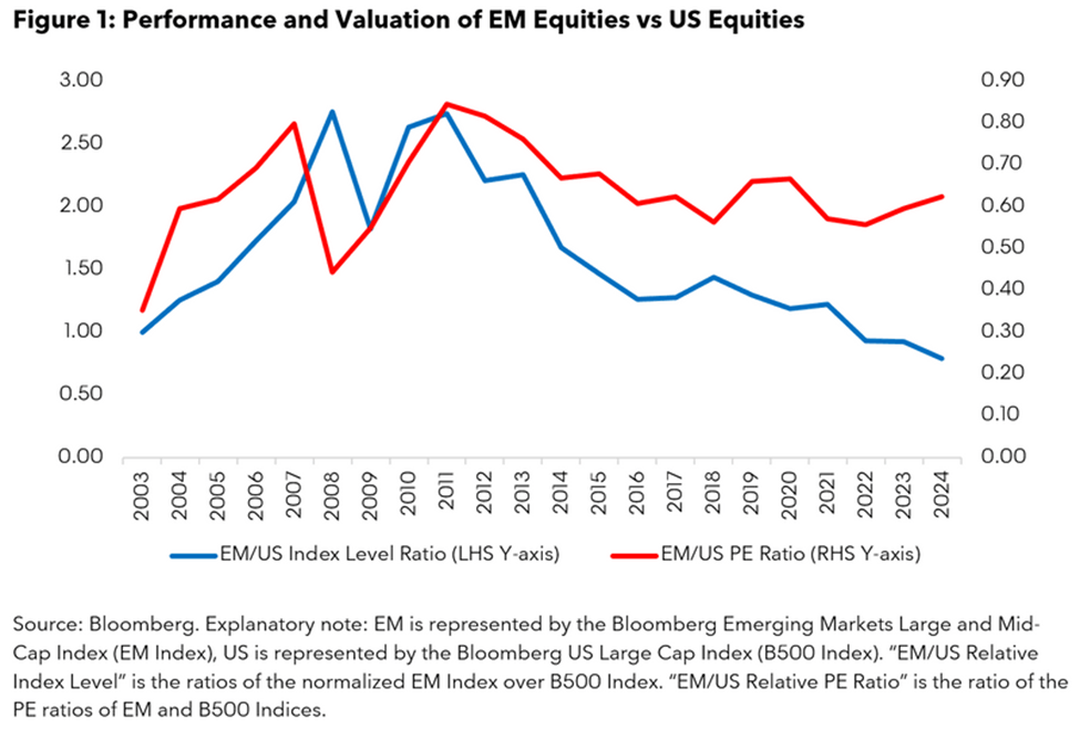 Apesar destes desafios, o potencial de retorno ao investir em ações de mercados emergentes (EMs) tornam essas ações uma opção atraente para investidores dispostos a enfrentar os riscos geopolíticos. Como as ações de EMs têm tido um desempenho inferior às ações dos EUA por mais de uma década, é fácil esquecer que as ações de EMs superaram fortemente as ações dos EUA na década de 2000 [Figura 1]. Hoje, as ações de mercados emergentes oferecem suas perspectivas mais atraentes em duas décadas, com o ratio Preço/Lucro (PL) do índice EM em relação ao índice US Large Cap (B500 Index) atingindo uma baixa em 2022 não vista desde 2004. Além disso, a reestruturação em andamento das cadeias de fornecimento mundiais por meio de near-shoring ou friend-shoring está abrindo oportunidades econômicas significativas para empresas sediadas em países emergentes que são vistas como parceiros mais confiáveis pelos EUA e outras economias ocidentais avançadas.