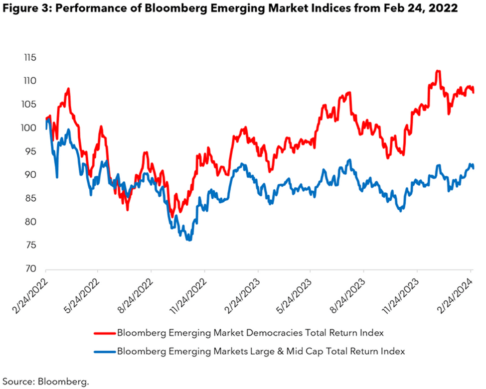 Desde 20 de abril de 2015, o índice BFREE tem superado consistentemente o índice EM convencional da Bloomberg em até 40% nos retornos totais acumulados. Este desempenho superior tem sido notavelmente maior ao longo dos últimos dois anos. Desde 24 de fevereiro de 2022, ou o início da invasão russa na Ucrânia, o índice BFREE superou o desempenho do índice EM em 16%. Enquanto o índice EM sofreu uma queda significativa em 2022, da qual ainda não se recuperou totalmente, o índice BFREE passou por uma queda mais leve e exibiu uma recuperação robusta.