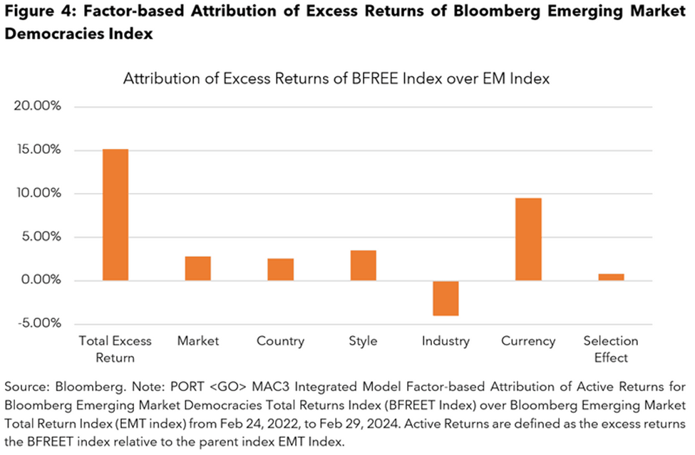 Na Figura 4, os retornos excedentes acumulados do Índice BFREE em relação ao índice EM são divididos nos componentes do fator ações. De 24 de fevereiro de 2022 até 28 de fevereiro de 2024, cerca de dois terços dos retornos excedentes do índice BFREE podem ser atribuídos a exposições a moedas vantajosas. Isto inclui subponderação (ou menor relevância) da China e posições com maior peso no México e no Brasil. O México e o Brasil são democracias eleitorais, enquanto a China não é.