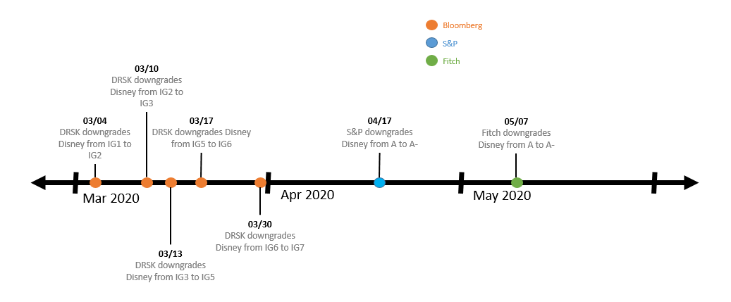 A linha do tempo acima mostra os rebaixamentos da Walt Disney Company, membro do S&P 500, tanto pelo DRSK quanto pelas principais agências de rating, durante o período de 100 dias analisado.