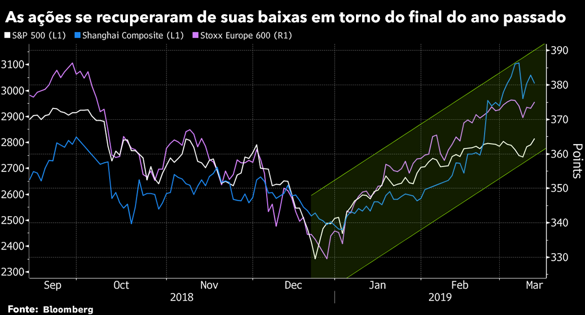 Liderados pelo Fed, muitos bancos centrais seguraram o aperto da política monetária ou introduziram novos estímulos, diminuindo o temor dos investidores a respeito de uma desaceleração. O presidente do Fed, Jerome Powell, diz que ele e os colegas terão paciência para elevar as taxas de juros novamente, enquanto o presidente do Banco Central Europeu, Mario Draghi, descartou fazê-lo neste ano e revelou um novo lote de empréstimos baratos para os bancos.