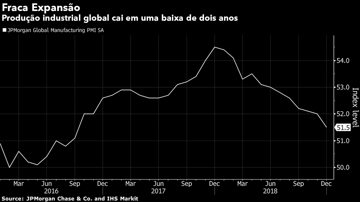 Em dezembro, o índice de manufatura global calculado por JPMorgan Chase e IHS Markit caiu para o menor patamar desde setembro de 2016, derrubado por componentes que acompanham encomendas e contratações, de acordo com dados divulgados na quarta-feira. Outros relatórios recentes da IHS Markit mostraram piora da situação nas fábricas em países asiáticos voltados para exportação: a China sinalizou contração pela primeira vez desde meados de 2017 e Taiwan, Malásia e Coreia do Sul também sugerem recuos. Na zona do euro, a expansão industrial é a menor em quase três anos.