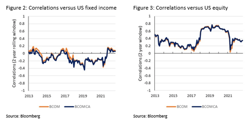 Os betas de inflação, juntamente com as correlações das classes de ativos, sugerem que o benchmark Carbon Tilted do BCOM pode ser usado de maneira semelhante ao benchmark BCOM para fins de alocação de ativos — por exemplo, em um portfólio base. Ele tem tanto o potencial de diversificação quanto uma correlação positiva com ambos os tipos de inflação, reconhecendo as emissões provocadas pelos ativos dos quais os retornos são derivados. Desde 2012, o resultado da inclinação para ponderações de commodities foi uma redução de aproximadamente 20% nas emissões por unidade em comparação com o benchmark BCOM. Por meio do procedimento de inclinação, o benchmark pode ser personalizado para levar em conta os prós e contras da redução nas emissões associadas e do erro de rastreamento anualizado em relação ao benchmark BCOM.