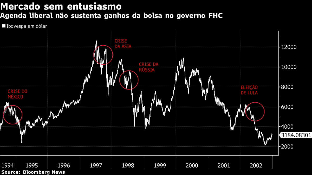 Com FHC, apesar da agenda elogiada pelo mercado, o Ibovespa caiu em cinco dos oito anos do governo, enquanto o real se enfraqueceu em todos os anos de 1995 a 2002 – com direito a uma maxidesvalorização cambial no último ano do mandato, diante do estresse com a eleição de Lula. Com Bolsonaro, o rali dos mercados anterior à eleição já se esgotou, enquanto os investidores estrangeiros aguardam de fora sinais mais claros sobre a capacidade do presidente implementar seu programa liberal e sobre os rumos do mercado global.