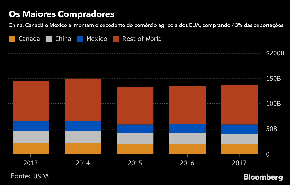 A agricultura é a terceira maior indústria exportadora dos EUA e uma potência global que gerou seis décadas de superávits comerciais. Ela também se tornou um ponto crítico nas batalhas tarifárias com a China, que comprou US$ 12 bilhões em soja no ano passado e agora está optando pela oferta da América do Sul. Outras tarifas afetam as vendas para o Canadá e o México, que estão renegociando o Acordo de Livre Comércio da América do Norte com os EUA.