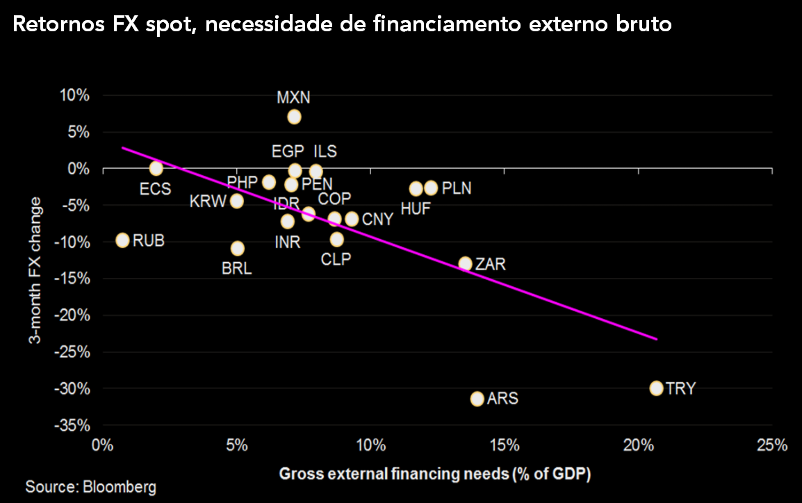 Isso é consistente com a correlação negativa entre as necessidades de financiamento externo bruto e os retornos da taxa de câmbio nos três meses até setembro. Os resultados ajudam a justificar o recente sell-off na lira turca, peso argentino e rand sul-africano.