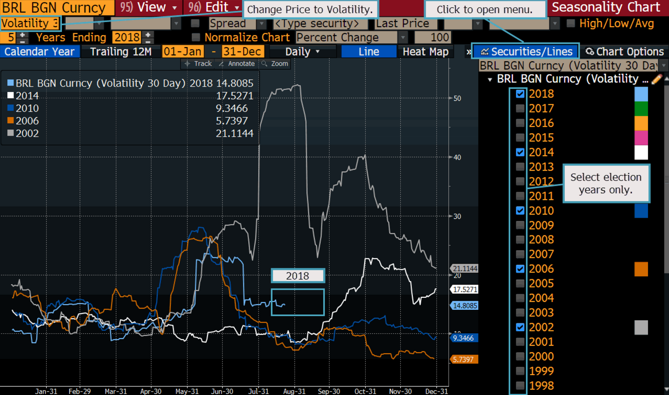 O Terminal Bloomberg te ajuda a acompanhar a volatilidade sazonal do real no período atual, comparar com ciclos eleitorais passados e incorporar resultados das pesquisas de intenção de voto nas suas análises.