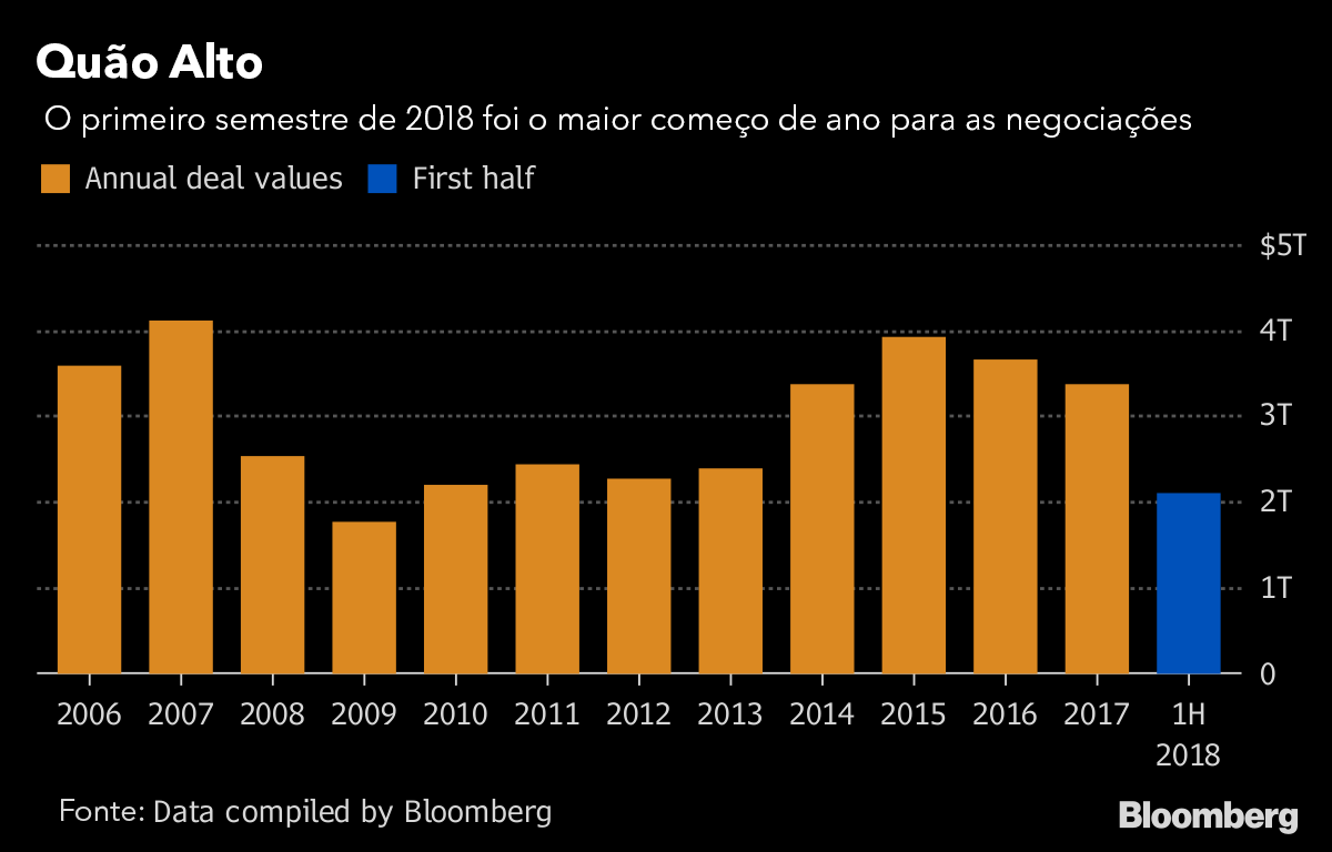 As empresas anunciaram US$ 2,1 trilhões em transações no primeiro semestre de 2018, o que encaminha este ano para superar o total de US$ 4,1 trilhões de 2007, segundo dados compilados pela Bloomberg. Vinte e quatro aquisições avaliadas em mais de US$ 10 bilhões fortaleceram os números, segundo os dados, como a aquisição da Shire pela Takeda Pharmaceutical, por US$ 62 bilhões, e a aquisição da Sprint pela T-Mobile US, por US$ 26,5 bilhões.