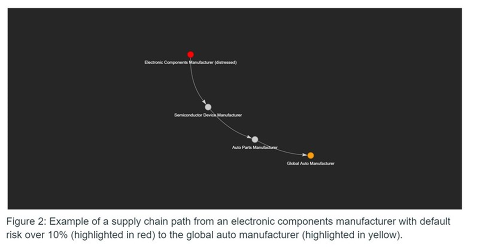 Concentramo-nos na rede da cadeia de fornecimento de uma fabricante global de automóveis, transformando conjuntos de dados complexos para gerar insights acionáveis. Destacamos três fatores de risco que nossos clientes consideram ao avaliar os riscos de sua cadeia de fornecimento: risco de inadimplência, risco de sanções e risco climático.