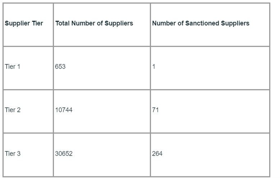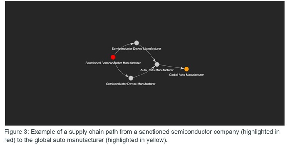 De acordo com a McKinsey and Company, apenas 10% dos líderes da cadeia de fornecimento pesquisados pela empresa de consultoria em 2022 tinham visibilidade de seus fornecedores de nível 3. Usando os dados de cadeias de cadeias de fornecimento e sanções da Bloomberg, os clientes podem identificar a exposição indireta a empresas sancionadas e conversar com seus fornecedores para identificar alternativas.