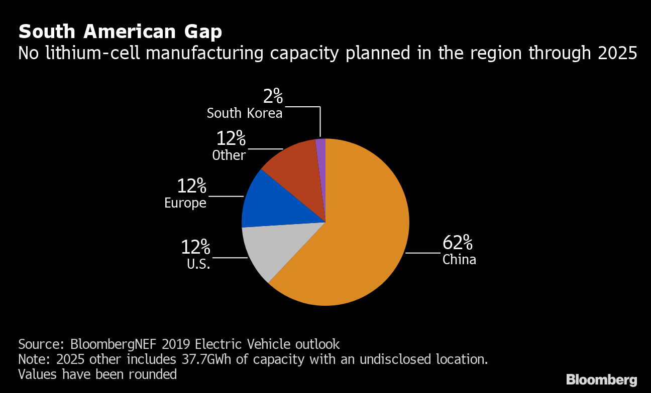 As instalações de refino de lítio e montagem de baterias podem ajudar a impulsionar setores em economias muito dependentes de commodities para obter receita, o que coloca esses países em risco devido às acentuadas oscilações de preços. Até agora, porém, iniciativas de governos e do setor privado na Argentina, Bolívia, Brasil e Chile não conseguiram erguer uma única fábrica de células de lítio. E não há previsão de que haja alguma antes de 2025.