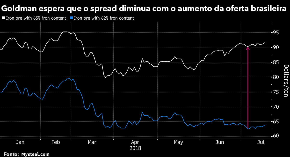 “Nos últimos 30 dias, as exportações de minério de ferro do Brasil vêm aumentando, o que sugere que o prêmio do minério de 66 por cento em relação ao de 62 por cento pode diminuir um pouco”, informou o Goldman na nota de 18 de julho. Haverá um “declínio parcial” do prêmio, afirmou, sem oferecer uma perspectiva precisa.