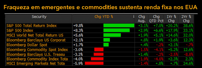 A queda dos preços de commodities é inconsistente com a recuperação da economia global, a menos que sinalize o aumento do risco macroeconômico. Esse quadro coloca o mercado acionário dos EUA em desvantagem. Tensões comerciais e o colapso do mercado na Turquia contribuíram para que o Bloomberg Commodity Index (BCOM) voltasse à zona inicial de suporte observada entre a máxima do primeiro trimestre de 2017 e a mínima no último trimestre daquele ano. Os rendimentos da renda fixa começaram a reagir à correção de quase 10% no BCOM, com o título do Tesouro americano com prazo de 10 anos se distanciando da resistência de 3%.