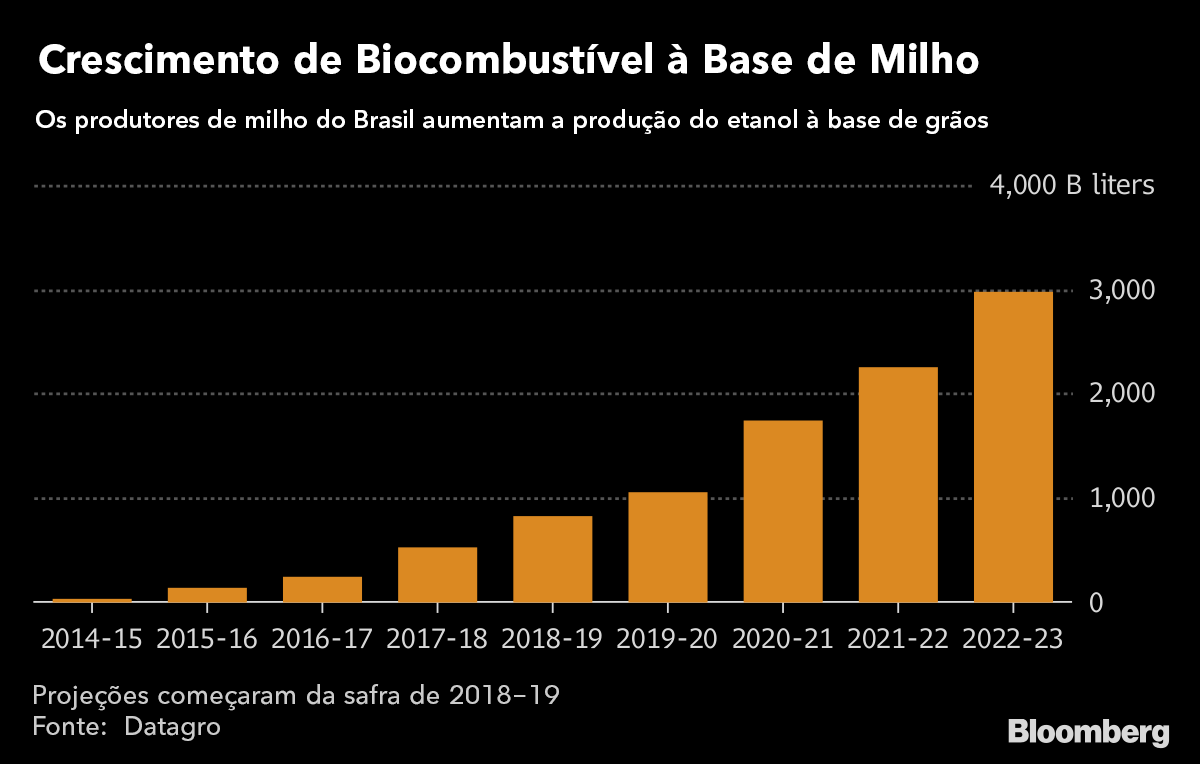 A produção brasileira de etanol à base de milho deve ultrapassar a marca de 1 bilhão de litros pela primeira vez nesta temporada, de acordo com a INTL FCStone. Embora o número seja apenas uma pequena fração do mercado de biocombustível do país sul-americano, de 31 bilhões de litros, a produção deve se expandir rapidamente nos próximos anos em meio a uma onda de investimentos em que mais de uma dúzia de novas usinas estão planejadas.