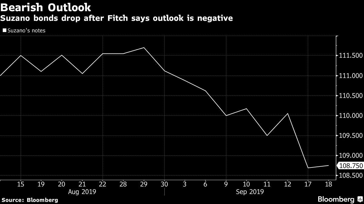 Os títulos de US$ 1,75 bilhão da Suzano com vencimento em 2029 acumulam queda de cerca de 2% este mês, para 108,75 centavos de dólar. A desvalorização se acentuou depois que a Fitch colocou a nota da empresa em perspectiva negativa em 6 de setembro. Com a queda, os títulos da Suzano mostram o pior desempenho entre rivais com grau de investimento em mercados emergentes este mês, justo no momento em que a maior produtora mundial de celulose tenta reduzir o endividamento.