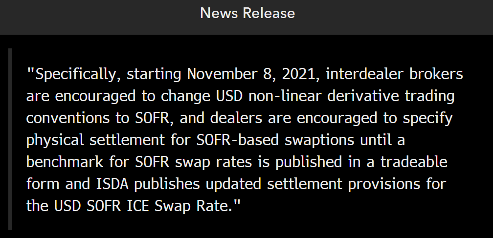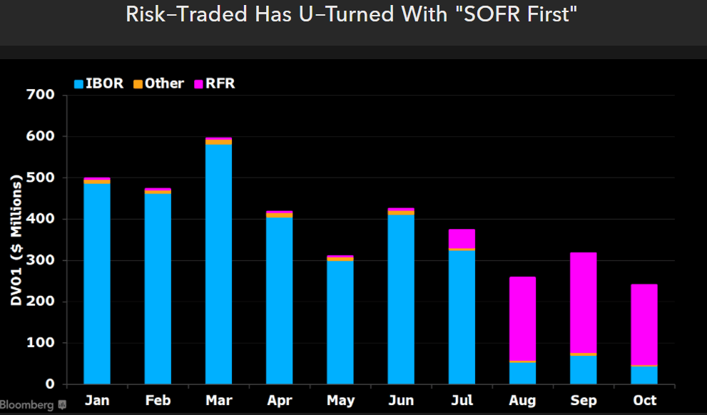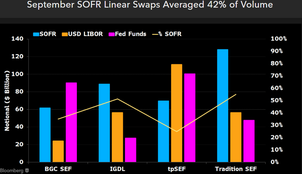 Um salto nos swaps lineares referenciados à taxa de financiamento overnight garantida (SOFR, na sigla em inglês) — a suposta sucessora da LIBOR em dólar americano — após uma pressão para que os brokers interdealer abandonem a LIBOR definitivamente em 25 de outubro, sugere que estes prazos também deveriam ser aplicados a outras áreas do mercado para impulsionar efeitos semelhantes. Reguladores estabeleceram um prazo até o fim do ano para abandonar novas negociações referenciadas à LIBOR.