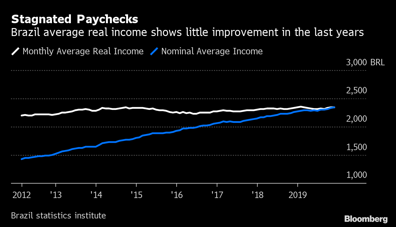 A renda líquida média ajustada pela inflação está estagnada desde pelo menos 2012, segundo o IBGE, coincidindo com anos de fraco crescimento econômico. Ao considerar trabalhadores por conta própria, a renda média é ainda menor. Para piorar, novos contratados recebem, em média, salários mais baixos do que trabalhadores que foram demitidos, segundo estudo do Itaú Unibanco.