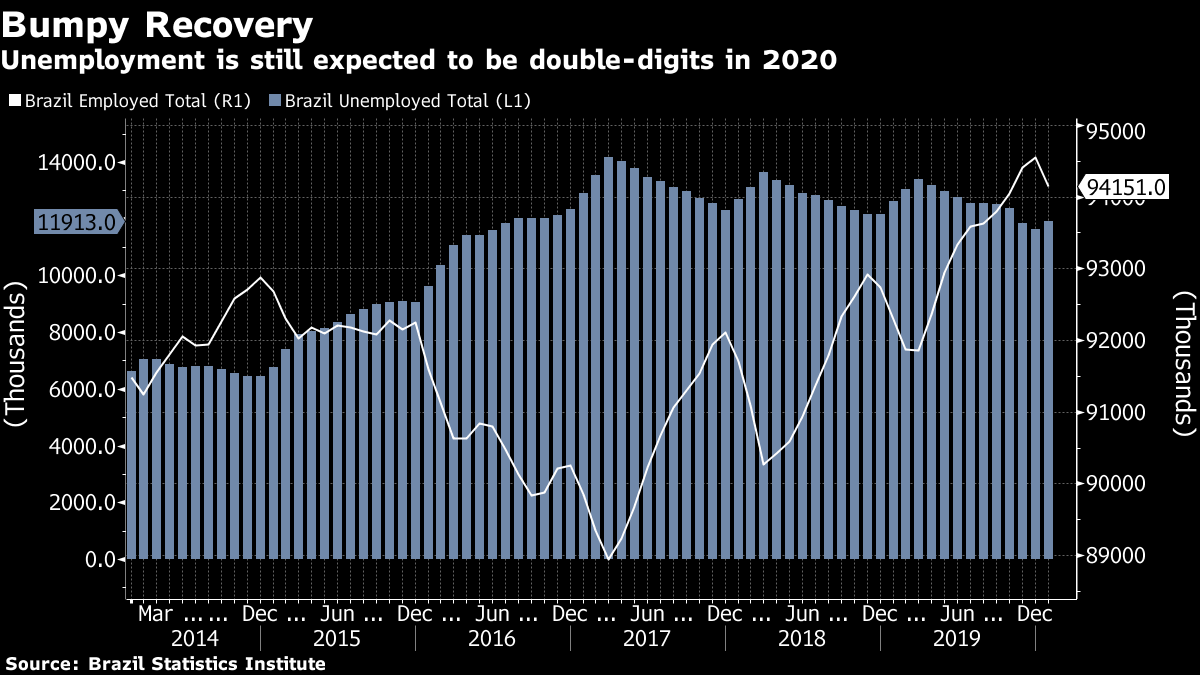 A taxa de desemprego no trimestre até janeiro subiu pela primeira vez desde o início de 2019, para 11,2%, segundo dados divulgados na sexta-feira. Embora o índice seja menor do que há um ano, o desemprego deve permanecer na casa de dois dígitos ao longo de 2020, segundo projeções.