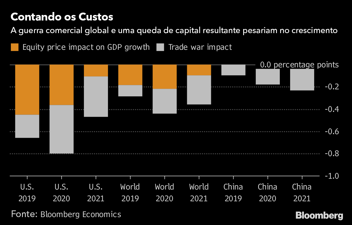 Se o presidente americano de fato aplicar tarifas de importação sobre US$ 250 bilhões em produtos chineses, a taxa de crescimento seria reduzida em 0,3 a 0,4 ponto percentual nos EUA e em 0,3 ponto percentual na China, de acordo com o Morgan Stanley. Outro risco seria a complicação das cadeias de suprimentos atingir indiretamente a China, subtraindo também 0,3 ponto percentual do ritmo de expansão.